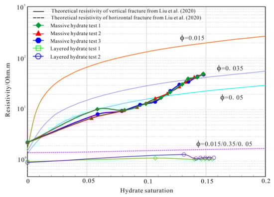 Comparisons between experimental results and the theoretical resistivity of gas hydrate-filled fractures from Liu et al., (2020) [33].
