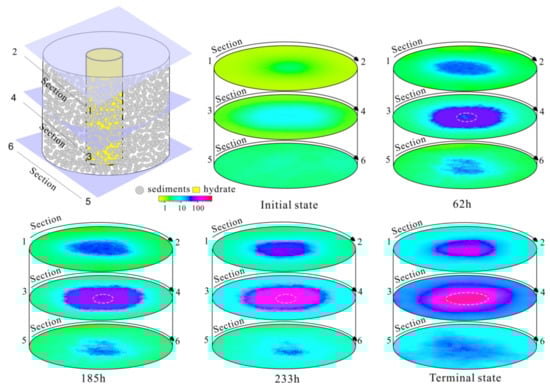From the images of massive hydrate and layered hydrate at different times (Figure 4 and Figure 5), the greater the resistivity difference between the hydrate area and surrounding sediments, the more distinct the boundary. When the resistivity of fine-grained sediments remains unchanged, the boundary of layered hydrate in the quadrilateral area of Figure 5 becomes increasingly obvious with the hydrate formation in quartz sands. The boundaries of massive hydrate and the boundary of layered hydrate change over time. The position of hydrate formation is decided by the spatial distribution difference of salt ions concentration [30]. Therefore, the diffusion of salt ions in sediments causes boundary changes.