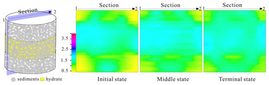 Figure 5 shows the three-dimensional resistivity image of the layered hydrate, clearly identifying the layered hydrate in sediments. In the initial state, the high resistivity of quartz sands distributed in the layer is identified. In the middle state, the resistivity increases because of hydrate formation. However, the resistivity in some places decreases in the terminal state. The effect of “salt-removing” during the hydrate formation increases the salinity of pore water [37]. As a result, the resistivity of layered hydrate in some places decreases, which is also observed in previous results [30]. At the low hydrate stages, the resistivity of pore-filling hydrate sediments increases slowly with the formation of hydrate [35]. The hydrate formed in sandy sediments can be considered as pore-filling hydrate. Therefore, the resistivity changes a little in this area, increasing from 1 to 2.6 .