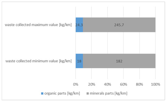 The maximum amount of street cleaning waste collected was 270 kg/km, while the minimum was 200 kg/km. The content of organic parts was 9% and the content of mineral parts was 91%, which are shown in Figure 1.