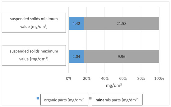 The maximum collected suspended solids from street cleaning was 26 mg/dm3, while the minimum was 12 mg/dm3. The organic content of the suspended solids was 17% and the mineral content was 83%, which are shown in Figure 2.