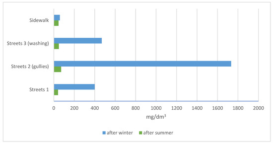The low chloride concentrations on the sidewalks are due to a ban on salt gritting the sidewalks. The high concentration of chlorides at sewer gullies is due to runoff into the sewer system and the accumulation of street runoff along with sweepings near the gullies. This high average concentration of chlorides present in street cleaning residues is due to the long, snowy, and cold winter, during which roads were abundantly gritted with sand and salt.