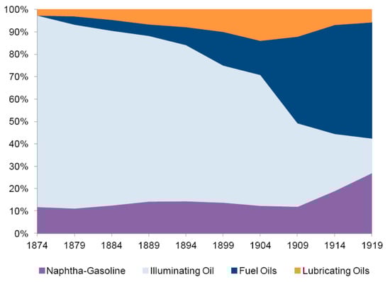 Shares of U.S. oil refinery output from 1874 to 1919 [17].