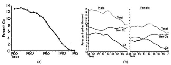 Moreover, the ease of access to carbon monoxide through the residential pipeline also tended to increase the suicide rate [63]. Figure 4 shows the relationship between CO percentage in the residential gas supply and the suicide rates in England and Wales. In the 1940s, the CO percentage in town gas of U.K. was between 10% and 20%. In the 1950s, a method of manufacturing gas from oil products and naphtha began to be adopted, which decreased the CO percentage in this noncoal-based gas down to around 1%. Meanwhile, natural gas was discovered worldwide, and it quickly gained popularity in the U.K. due to its high heating value, CO-free, clean combustion performance, and continuously decreasing price due to its abundant supply. By 1971, around 69% of the gas in the U.K. domestic gas supply system was natural gas. As can be seen in Figure 4a, CO was almost depleted from the U.K. residential gas supply system by 1975. Figure 4b shows the correlated suicide rates of England and Wales, which clearly notes that the rate of CO poisoning suicide significantly decreased, as there was less access to CO from pipelines in homes.