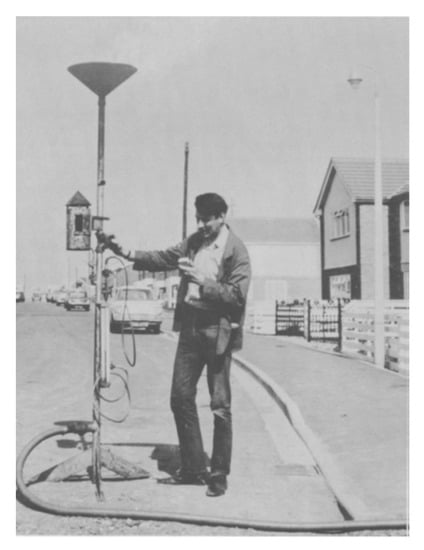 This town-gas-to-natural-gas transition in residential homes was a huge task in British energy development history. More than 13.5 million sites had to be visited with 35 million appliances (200 million burners) and more than 8000 residential appliance models to convert. Because conversion always brings inconvenience to the residential gas end-users, the British Gas Council (British Gas Corporation after 1972) decided to provide advantageous terms for a new appliance purchase, or even offer it free of charge, when the old appliances could not be converted successfully. The British Gas Council also decided to supply the replacement parts to residential houses, so the conversion could be completed on-site. This was more efficient and cheaper compared to shipping the appliances to specific places and conducting conversion there. Figure 5 shows an on-site town gas purging using natural gas in England. To achieve this fuel conversion, not only were the training/education programs provided to technicians but the marketing strategies/advertisement of natural gas to the public were also equally, if not more, emphasized. For example, the first demonstration fuel conversion project was completed on Canvey Island, which gained public confidence in the fuel conversion. To assist the transition, the Conversion Executive was founded to coordinate among the British Gas Council, Area Boards, and the Society of British Industries, which represented the benefit of appliance manufacturers and contractors. At the same time, public relation strategies were adopted, including providing conversion handbooks/manuals, developing a better understanding of local conditions, and approaching gas end-users of different social classes/income levels using varying methods [69,70].