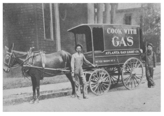 The United States experienced a different procedure of adopting natural gas in residential homes compared to the British way. Before the gas transition, the U.K. had already built a relatively mature town gas industry and gas transporting system beginning in the 1800s and then experienced an organized state-led town-gas-to-natural-gas transition by an almost monopolistic strategy developed by the British Gas Council and the British Government. However, being the world’s largest bastion of free market and entrepreneurship, the U.S. natural gas industry was developed in parallel with its manufactured gas industry due to the abundant and cheap supply of natural gas from international trades. From the late 1800s to the early 1900s, U.S. gas companies provided both manufactured gas and natural gas separately to customers depending on their specific needs. Figure 6 shows a gas company that used a wagon to advertise domestic gas usage in the early 1900s. In the U.S., the sale of natural gas exceeded that of manufactured gas in 1935. In the late 1940s, manufactured gas began to be phased out and ultimately replaced by natural gas in the 1950s [50]. However, at that time, the U.K. had not yet started the conversion project.
