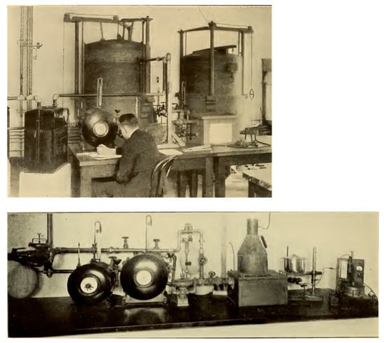 In the late 19th century, the large cost increase in gas-making materials resulted in frequent manufactured gas price increases in the United States. In some localities, the gas price increase compelled a decrease in standards of quality. At that time, natural gas production was not as abundant as today. Therefore, a variety of gases were available on the market, including natural gas, manufactured gas, or artificially lower-standard manufactured gas. As a result, the investigation of residential burner mechanisms operating on multiple gases was conducted. The American Gas Association started to work on the project of improving the gas-utilization efficiency, which was one of its earliest tasks after its foundation in 1918. Meanwhile, the engineering section of the U.S. Bureau of Standards started to investigate the design and operation of atmospheric burners, which were, and still are, commonly adopted in residential appliances. Through these studies in the early 1900s, a better understanding of residential appliance burner working principles was obtained [79]. Later in 1932, other than the burner efficiency, reducing emissions from combustion such as carbon monoxide also became a consideration in residential burner design [80]. Therefore, more detailed residential burner optimization started to be conducted considering efficiency, flame characteristics, carbon monoxide emission, etc. [81]. The test setup for residential burners is shown in Figure 7.