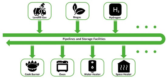 With the depletion of natural gas reserves and the urgency to reduce carbon emissions to combat climate change, replacing natural gas with renewable gases in pipelines has been of interest not only to fossil-fuel-dependent countries but also to all of human society. Although many complexities remain to be sorted out, reducing carbon emissions by replacing fossil fuels with renewable energy is a strategy that has international consensus, as evidenced by the endorsement of the United Nations Framework Convention on Climate Change in 1992 [83]. For the residential sector, one of the most effective ways of adopting renewable energy is to replace pipeline natural gas with renewable gases [84], as shown in Figure 8. The benefits of adopting renewable fuels in natural gas pipeline infrastructure include: