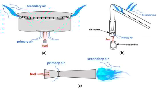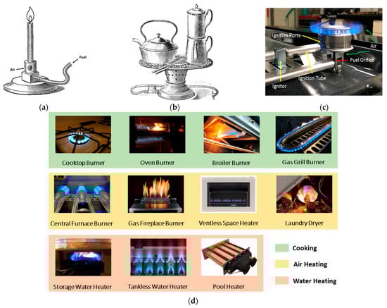 The past few decades have witnessed astonishing combustion technology advancement in gas turbines, internal combustion engines, and other industrial applications. Moreover, the strict emission regulations on high-energy-consuming devices greatly boosted their combustion technology advancement. Take heavy-duty gas turbines, for example: water was injected into the combustor to reduce NOX emissions in the 1970s. As emission regulations are becoming more stringent, numerous technologies have been developed to reduce NOX emissions, including rich burn-quick mix-lean burn (RQL) technology [3], dry low NOX (DLN) lean premixed combustion [4], mild combustion [5], etc. Post-combustion pollutant-elimination technologies, such as Selective Catalytic Reduction (SCR), are also being adopted to further decrease gas turbine NOX emissions down to the single-digit ppm level [6]. Although the emission levels of the high-energy-consumption units are already very low, a lot of investment and effort is still being invested to further decrease or possibly eliminate the emissions from those devices altogether. In contrast, the emission level of some appliances can stay at around a couple hundred ppm without attracting much attention from policymakers. Moreover, the combustion technologies used in gas appliances are the same as 100 years ago, which were mainly adopted from Bunsen flames [7,8].
