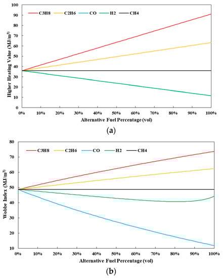Renewable gases such as biogas and renewable hydrogen are becoming available at a much lower price than most non-combustion renewable energy sources and can also be generated from multiple renewable sources. For example, biogas can be produced from wood and agricultural products, landfill waste, sewage, etc. [13]. Injecting purified biogas into existing natural gas pipelines has already been adopted and has gained much success in reducing carbon emissions [14]. Besides biogas, hydrogen is also a competitive and promising fuel for the future due to its high energy density on the mass base and the many ways it can be generated. The carbon-free property of hydrogen inherently reduces greenhouse gas emissions when generated renewably. Renewable sources for hydrogen include biomass, solar energy, wind power, and water electrolysis using grid power [15,16]. The adoption of these renewable gases in existing natural gas pipelines should be easier and cheaper for end users without much capital investment and maintenance. Biogas or hydrogen injection into the existing natural gas pipeline needs technical evaluation and fuel-interchangeability studies. However, gas appliance manufacturers and gas utility companies are still using the flame indices from the 1920s to guide their fuel-interchangeability investigations. Therefore, more comprehensive considerations should be given to guide appliance performance upgrades while adopting renewable fuels.