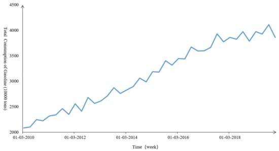 Since gasoline is a typical refined oil product with the largest consumption and the widest use range in China, this article selects the demand data for 93# gasoline as the research object to conduct predictive analysis. At the same time, for this research we selected the quarterly data of the total demand for 93# gasoline in China from Q1, 2010 to Q4, 2019 for the experiments. All of the data regarding gasoline demand were obtained from the Wind Database (http://www.wind.com.cn/), as shown in Figure 2.