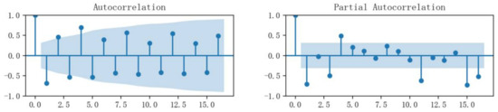 In order to build a forecast model of the quarterly demand data for 93# gasoline, it is necessary first to determine a suitable lag period. For this purpose, the original time series of the 93# gasoline demand data were processed by the first-order difference, and then the ACF and PACF were calculated to determine the lag orders, as shown in Figure 3.