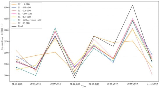 In the trend- and periodicity-trait-driven decomposition-ensemble prediction model, the decomposition method uses the X11 seasonal decomposition model, the component prediction method was uniformly selected from the above single models, and the ensemble method adopts additive (ADD) integration. Considering the above single models and decomposition-ensemble prediction models, the gasoline demand forecasting performance of the data-trait-driven decomposition-ensemble prediction model was explored. In order to compare the differences in the prediction accuracy between the ordinary decomposition-ensemble model without considering the characteristics of the component data and the data-trait-driven decomposition-ensemble model, this paper first tried to use the same predictive model for the different components and then tried to select different predictive models for different components in terms of the data traits to highlight the role of data-trait-driven modeling.