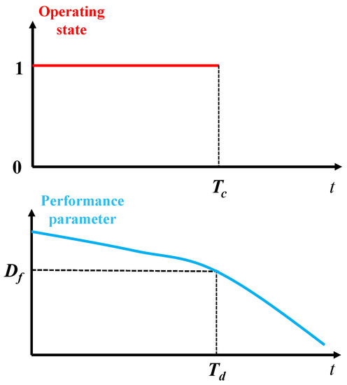 Catastrophic failure is also called hard failure, in which a unit suddenly fails as a result of some external shock(s), such as power supply failure due to lightning, communication faults, etc. Therefore, a catastrophic failure is generally represented by two states—a normal operating state (denoted as 1), and a failed state (denoted as 0)—as shown in Figure 1 [33]. In contrast, degradation failure is also called soft failure, in which a failure occurs when the unit’s performance deteriorates to a pre-specified threshold due to wear, fatigue, erosion, or other causes [34], as also shown in Figure 1. Unlike catastrophic failure, when the degradation failure occurs, the unit is still working, albeit at a reduced level of performance. Note that the nomenclature of the variables in Figure 1 is listed in the Nomenclature section.