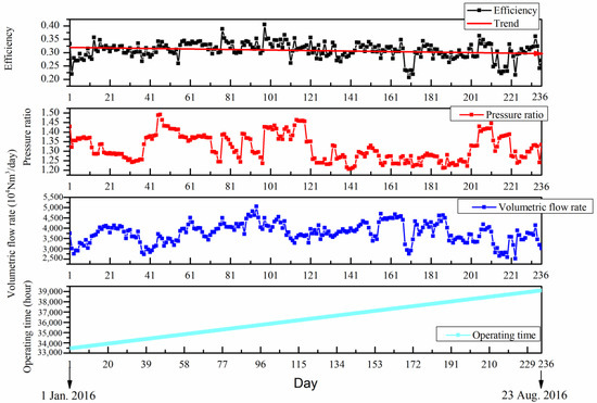 In this section, the reliability of a natural gas compressor unit running in a natural gas transmission pipeline is analyzed using the proposed methodology. The compressor unit is the No. 2 unit at the ZW station located in China. In addition, the compressor unit is composed of a centrifugal compressor and a gas turbine, the models of which are RF2BB36 and RB211-GT62, respectively. The reliability of the compressor unit during the period from 24 August to 22 September in 2016 was predicted, and both the historical failure data and the performance data of the natural gas compressor unit were collected. More specifically, we also collected the historical failure data of both this unit and other units of the same type caused by catastrophic failures during the period from 1 January 2014 to 23 August 2016, as shown in Table 2. The operating data—including volumetric rates and pressure ratios—from 1 January to 23 August in 2016 were measured, and the corresponding performance data were calculated, as presented in Figure 3. It should be noted that in addition to the repair period after the catastrophic failures, no other maintenance activity was carried out during the period of the data collection.