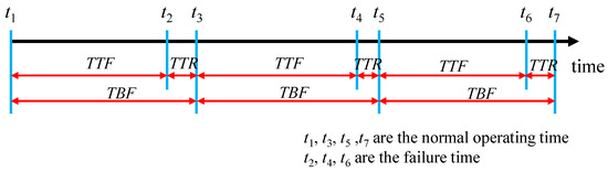 From the data in Table 2, the time along the catastrophic failures can be determined. Moreover, the relationships between the time between failures (TBF), the time to repair (TTR), and the time to failure (TTF) are shown in Figure 4. Since the TTR is very short compared to the TTF for the units’ catastrophic failures based on the field data, the time to catastrophic failure Tc is approximately equal to the time between catastrophic failures in this case study, and the time to catastrophic failure Tc is listed in Table 3.