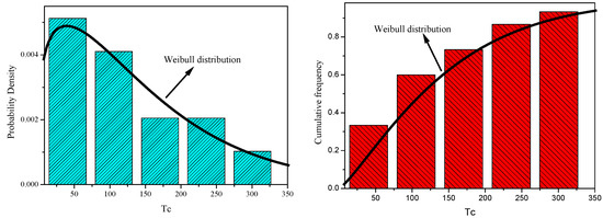 Step 4: Based on the calculation results of the correlation coefficient in Step 3, the optimal distribution for the time to catastrophic failures Tc is selected, namely, the failure probability function Pc(t). Moreover, Pearson’s chi-squared test is used to determine whether the time to catastrophic failure matches the selected optimal distribution.