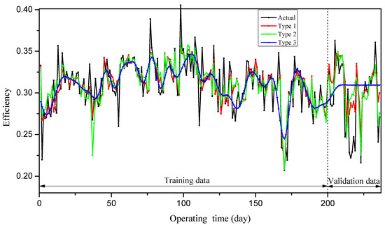 In Table 5, a summary of the RMSE of the training data and validation data for the three types of model inputs is presented, and the comparisons of the predicted values and actual values are shown in Figure 6. One can observe that the RMSE of the first type of model input is the smallest among the three types, and the predicted values are consistent with the actual values in both the training data and the validation data. Moreover, the assessment results indicate the significant impact of the operating conditions on the precise forecasting of the performance parameter.