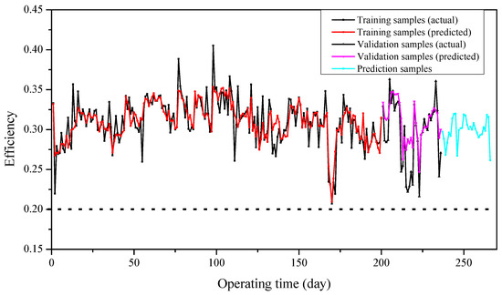 The SVM model described in Section 2.2 was utilized to predict the efficiency of the compressor unit throughout the mission time. As shown in Figure 5, the unit’s efficiency fluctuated randomly during operation rather than decreasing monotonically, due to the effect of the operating condition on the compressor unit’s efficiency. In fact, the changes in the unit’s performance parameters were related to the unit’s operating time and operating conditions. Moreover, from Equations (16) and (17), we know that the operating conditions are represented by the pressure ratio and volumetric flow rate. Therefore, the pressure ratio, the volumetric flow rate, and the cumulative operating time were selected as the input vectors of the SVM model.