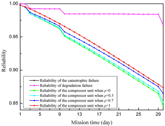 However, the information of the correlation coefficient between catastrophic failure and degradation failure is also lacking. Four levels of the correlation coefficient (ρ = 0, 0.3, 0.7, and 1) were employed to calculate the reliability of the compressor unit. The sensitivity of the correlation to the reliability was investigated, and these scenarios are summarized in Table 6.