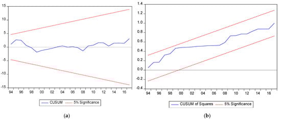 In addition, to make our results reliable and accurate, a series of diagnostic tests were conducted. The heteroscedasticity, serial correlation, normal distribution, and functional misspecification tests were used on the estimated models’ residuals to assess the residual and model’s stability diagnostics. The findings suggest that no heteroscedasticity or serial correlation exists. While the functional form of the model is correctly identified and explained, no evidence for the residual normal distribution is found. Furthermore, the cumulative sum and cumulative sum squared tests are employed to guarantee the stability of the model. As the findings of Figure 1 suggest, at a 5% significant level, the results clearly demonstrate the stable model.