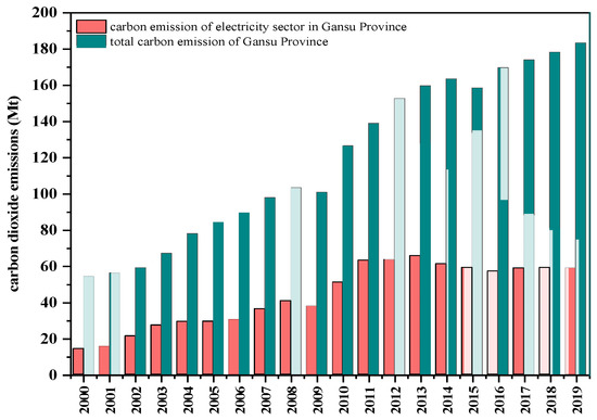 Total carbon emissions in Gansu Province and direct carbon emissions from the electricity sector from 2000 to 2019.