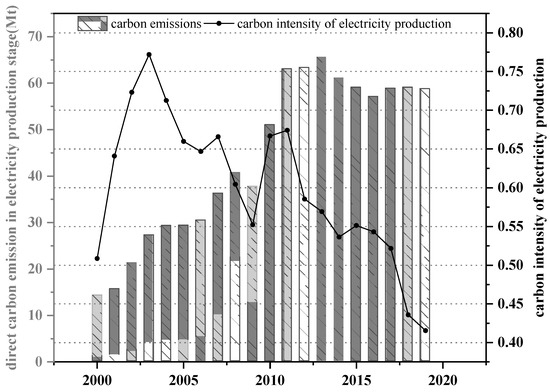 Carbon emissions from power production and carbon emission intensity in Gansu Province during 2000–2019.