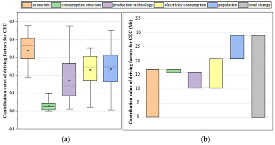 Contribution rates and contribution value of driving factors for CEC. (a) Contribution rates of driving factors for CEC. (b) Contribution value of driving factors for CEC.