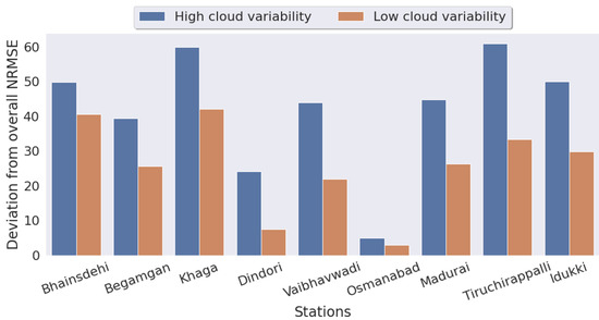 Deviation of NRMSE (%) in high and low cloud-cover variability conditions compared to overall NRMSE (%).