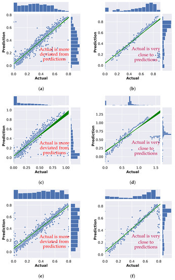 Parity plot showing forecast and actual clearness indices for three solar stations for high and low cloud-cover variability conditions. (a) Bhainsdehi (high cloud-cover variability); (b) Bhainsdehi (low cloud-cover variability); (c) Osmanabad (high cloud-cover variability); (d) Osmanabad (low cloud-cover variability); (e) Khaga (high cloud-cover variability); (f) Khaga (low cloud-cover variability).