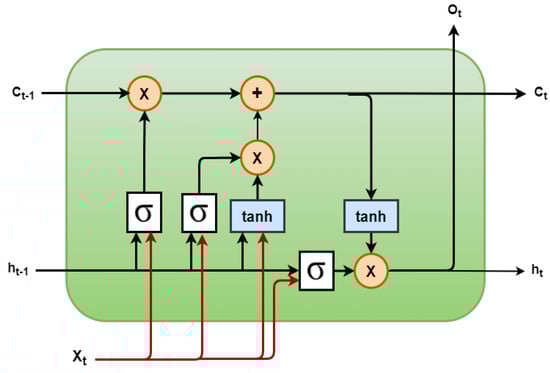 LSTMs are a special type of RNN that is especially designed to learn both long- and short-term dependencies [15]. Compared to a traditional neural network, LSTM units encompass a ‘memory cell’ that can retain and maintain information for long periods of time [28]. Figure 3 is a schematic diagram of an LSTM cell. A set of gates are used to customize the hidden states. Three different gates are used, representing input, forget, and output. The functionality of each gate is summarized as follows.