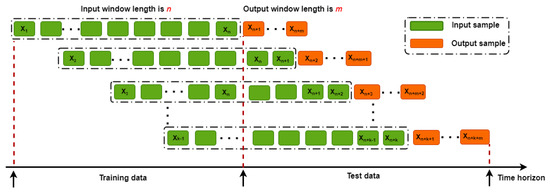 - Next, a standard sliding-window approach was applied to the time-series data to convert them into a suitable representation (supervised) for deep-learning models. Figure 4 depicts the generic approach of a sliding window with input and output window sizes n and m. The input window covered n past observations, such as {, , , …, }, and used to predict the next m observations as {, …, }. After that, the input window is shifted one position to the right as {, , , …, }, and {, …, } are the new input and output sequences. This process continues until no data points of the time series are left.