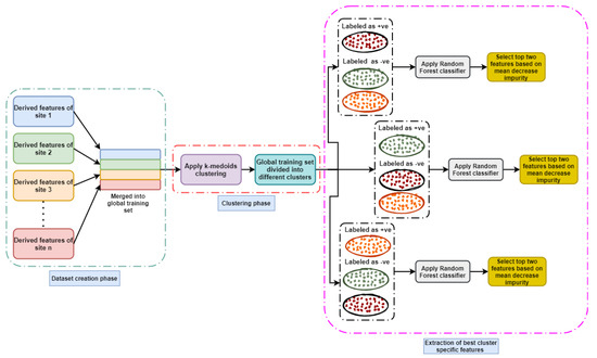 Figure 6 shows a cluster-specific feature identification to understand the important features of a cluster. For each forecasting site, a spatiotemporal dataset was created that was split into training (80%) and test sets (20%). A global dataset was created by combining the training sets of all the forecast sites, and normalized using the min–max normalizer [33]. Next, the optimal number of clusters was determined on the basis of the elbow–silhouette [34] method. The K-medoids algorithm is used to cluster the time windows in the dataset. As the input attributes were related to cloud formation, the clusters intuitively represent different cloud types. As a result, the dataset was split into k clusters, where each cluster center was represented by a medoid.
