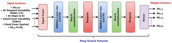 - For each cluster, separate stateless LSTM was built. The network was implemented using the keras package of version 2.7.0 in Python.The input layer of the LSTM consisted of 13 input features of 1 time step each. In the hidden layers, hyperbolic tangent activation function (tanh) was used. After each hidden layer, a batch-normalization [35] layer was used to transform inputs into a mean of 0 and a standard deviation of 1. We used a dropout and L2 regularization [36] to protect the network from overfitting. The network weights were initialized using the Xavier uniform initializer [37]. The output layer consisted of 8 nodes with linear activation and was used to forecast Kt for the next two hours. Figure 8 shows the network configuration of CB-LSTM together with input and output features. For obtaining the best performance of CB-LSTM, specific hyperparameters such as number of layers, number of nodes in each layer, batch size, number of epochs, dropout, and learning rate were optimized. The tree-structured Parzen estimator (TPE) [38] algorithm was used for optimization. Table 4 presents the hyperparameter settings. Table 5 shows the optimal hyperparameter settings for the proposed approach (CB-LSTM) in Section 4.