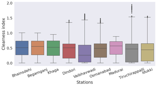 Figure 9 shows the average value and standard deviation of the clearness index for all forecasting sites. Greater variability was observed for Idukki, Vaibhavwadi, Tiruchirappalli, and Osmanabad. Khaga had the lowest variability.