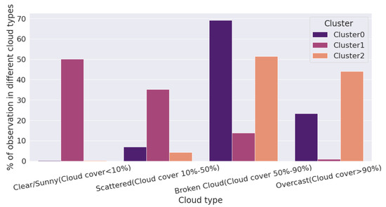 Figure 10 shows cluster-specific features, and K-medoids led to three clusters. Features were selected on the basis of the reduction in impurity scores. For Cluster 0, the mean decrease in impurity was highest for features Kt slope (1-h) and KtPrev15. For Cluster 1, cloud cover squared and KtPrev15-nearby-mean were the most important features. For Cluster 2, cloud cover squared and Kt Slope (1-h) were the most important features. To understand the cloud type of each cluster, we calculated the percentage of cloud-cover information falling in each cluster, and this is illustrated in Figure 11. For Cluster 0, the majority of observations belonged to the broken-cloud type. In Cluster 1, the majority of observations belonged to the clear/sunny-sky type. For Cluster 2, the total numbers of observations in the broken and bvercast cloud types were relatively similar.