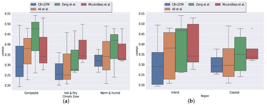 Figure 12a shows climatic-zone-specific variability in predictions of CB-LSTM in terms of NRMSE. clustering-based ANN [23] for the composite and hot and dry climatic zone, and RF-SVR [21] for the warm and humid climatic zone were the worst-performing models. For all climatic zones, CB-LSTM achieves the least prediction error.