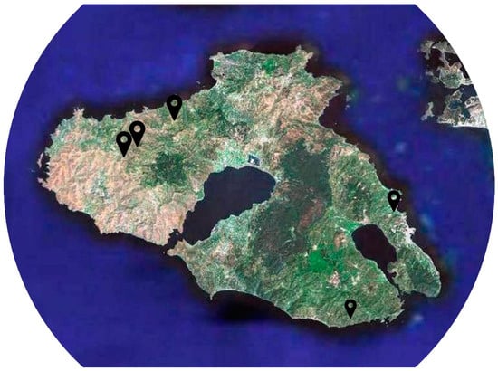 The samples that we collected for the experimental research came from the local winery “Volcano Anemotia”, which is located in the village Anemotia of the Municipality of West Lesvos. The winery was founded in the fall of 2017. It produces white, red, and rosé wines and in smaller quantities of tsipouro. The vineyards that the winery supplies its raw materials to are located at an altitude of 350 m, are arid, and with special characteristics that are betrayed by the microclimate of the caldera of Anemotia Volcano. The varieties that thrive in the area and are used for winemaking are Kalloniatiko, Mandilaria, Moschato Mavro, Fokiano, Athiri, and Assyrtiko. For the year 2021, the winery received 20,746 kg of grapes with the mass balance being reduced to 70–75%, giving a production of about 16,000 bottles of wine, with a reduction in production by 40% from the previous year due to prolonged high temperatures and reduced rainfall.