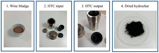 The main scope of this study was to sample wine sludge and valorize it under different pressure regimes of hydrothermal carbonization. The experimental analysis was conducted in the Energy Management Laboratory of the University of the Aegean, in order to further investigate the reactions of sludge samples with the process of hydrothermal carbonization. The samples were collected from local wineries on the island of Lesvos and the process of hydrothermal carbonization was utilized for the treatment and valorization of wine sludge into hydrochar. The hydrothermal reactor used for the experiments was a 25 mL reactor with a PTFE main body reactor covered with a metal casing, which allows it to generate autogenous pressures. Four experiments were performed with 6, 8, 10, and 12 mL of wine sludge that filled the hydrothermal reactor in percentages of 24%, 32%, 40%, and 48%, respectively. The reactor was then placed for each experiment in a Memmert furnace for 24 h and at a temperature of 200 °C. It is important to note that the operating pressure in each case is equal to the evolving pressure inside the reactor. The estimation of the difference between the initial and the final mass flows contained in the HTC autoclave reactor was assessed by the implementation of the mass balances for the gaseous, solid, and liquid streams, i.e., the hydrochar, the product gases, and the slurry. The mass of the gases was assessed by weighing the filled uncapped reactor before and after the HTC process. The produced hydrochar was determined by filtering the mixture through a simple coffee filter and then drying at 70–80 °C. The weight difference in the filter before and after filtration is the weight of the solid fuel fraction. For the assessment of the liquid fraction, the weight difference was measured by taking into consideration the mass of gases and the mass of the hydrochar. The raw material and the final dried hydrochar product are presented in Figure 2.