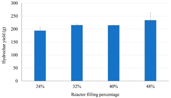 Figure 3 presents the percentage of the hydrochar yield (solid product) from hydrothermal carbonization of wine sludge. As shown in the figure, increasing filling percentages of the reactor resulted in increasing hydrochar yields, although the correlation seems not to be linear or consistent. For these specific experiments, increased pressure has a positive effect on the production of hydrochar, but more experiments need to be performed in the future in order to assess the limits of this effect. An aspect to be examined is the effect of the evolved pressure on the volatility of the volatile matter. According to the work by Xu et al. [24], there is correlation between fixed carbon content and hydrochar production.