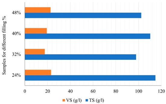Figure 4 presents the volatile solids (VS) for different filling percentages of the HTC reactor. Lower filling percentages seem to favor the production of total solids (TS). There is a fluctuation of the effect of increasing pressure regimes on the production of total solids and the percentage of volatile solids. It should be stated that the initial moisture level was measured at 88.96% which results in a total solids content of 11.04%. An interesting parameter as presented by Zhang et al. [11] and Vakalis et al. [21] is the effect of HTC on the volatile solids content. It should be stated that the uniqueness of this present study is that different pressure regimes were utilized, and this had a profound effect on the content of volatile solids in a manner that has not been depicted in previous studies. This will be part of upcoming work in order to assess in detail the mechanisms that may cause such effects.
