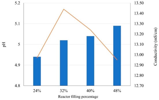 Figure 5 presents the pH and the electrical conductivity of the liquid fractions of the products from hydrothermal carbonization. The figure shows a clear tendency in respect to the pH values of the liquid products with increasing pressure. The electrical conductivity result of the liquid samples is interesting. The HTC treatment for 32% filling of the HTC reactor had significantly higher electrical conductivity than the other samples. By combining this result with the result from Figure 3, we can assume that some elements or molecules pass to the liquid phase in the filling percentage of the reactor (pressure regime) and this affects the electrical conductivity. In addition, hydrothermal carbonization is linked to the presence of acetic acid and propanoic acid in the liquid products [23] and this can explain the low pH values of the liquid products of wine sludge HTC.