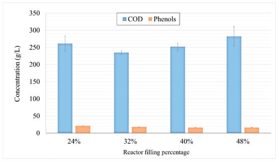 Figure 6 presents the chemical oxygen demand and the total phenolic content of the liquid fractions of the products from hydrothermal carbonization. We observe an initial drop in the COD value and then a subsequent increase. Interestingly, there was different observation in respect to the content of the total phenol. Total phenols decrease with increasing evolved pressure, but this flips at the highest filling percentage of the reactor, where the total phenolic content increases again. It should be further investigated whether a further increase in the evolved pressure will result in higher phenolic contents.