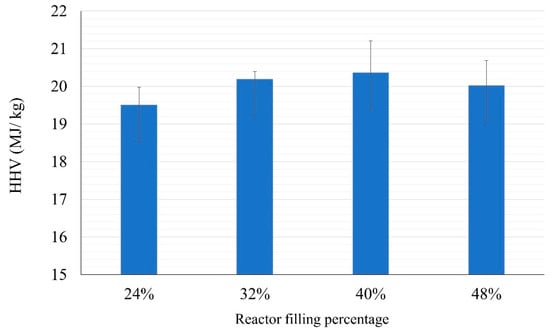 Figure 7 presents the higher heating values of the solid carbonaceous products from hydrothermal carbonization, i.e., the hydrochars. The figure presents two clear tendencies. On the one hand, the samples that are treated with up to 40% of the reactor’s filling percentage have increasing higher heating values. On the other hand, higher filling percentage results in decreasing higher heating values. The heating values are comparable to the values presented by other similar studies [25], which is a good indicator that there is potential for energetic valorization of hydrochars from wine sludge. The range of the heating value results can be explained by the selected temperature of HTC treatment, which has been shown to have an optimal effect on the heating value of hydrochar, e.g., the work presented by Shrestha et al. [26].
