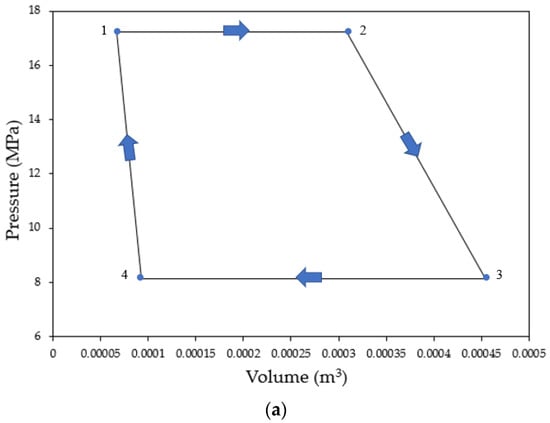 Process of sCO2 inside the cylinder: (a) pressure vs. volume diagram and (b) visual representation.