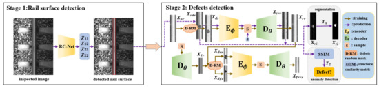 To overcome the above difficulties, inspired by the idea of self-supervised learning and Soft-IntroVAE [26], we proposed a two-stage rail surface defect detection system based on the rail surface cropping network (RC-Net) and defect removal autoencoder (DR-VAE). The system first locates and extracts the rail surface from the original image of the rail inspection vehicle by RC-Net, then it segments the defects and detects anomalies using the DR-VAE inference network. The contributions of this paper are summarized as follows: