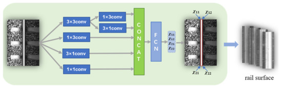 Based on the previous analysis, this paper proposed a simple and effective RC-Net for detection and extraction of the rail surface image from the rail inspection image. As shown in Figure 3, the input of RC-Net is the inspection image, and the output is the transverse coordinates of the four vertex pixels (x11, x12, x21, x22) of the rail surface. In order to minimize the capacity and improve the accuracy of model, we have streamlined the RC-Net to the maximum extent possible. The backbone consists of only an inception module [28] and a fully connected layer. The inception module consists of the 3 × 3, 1 × 1, 1 × 3 and 3 × 1 convolution layers to extract the edge pixels of the rail surface accurately. The 3 × 3 and 1 × 1 convolution kernels facilitate the extraction of local information of the rail edges compared to the large size convolution kernels, and the combination of the 1 × 3 and 3 × 1 convolution layers provides more diverse feature descriptions while reducing the computational effort, compared to the 3 × 3 convolution layer. Ultimately, for subsequent stages of model training and inference, we extracted the rail surface images based on the network output of the rail surface coordinates.