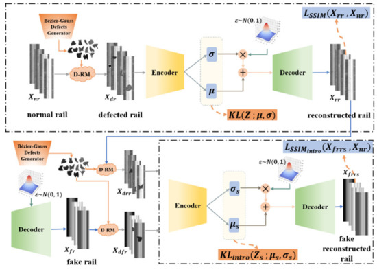 As we previously obtained rail surface images, this section details the rail surface defect detection model DR-VAE, including the training and the inference architecture, of which the training architecture is shown in Figure 4. Firstly, a Bézier–Gaussian random pseudo-defect was generated with an arbitrary shape and a random grayscale. Secondly, the D-RM module was used to add randomly located pseudo-defects to Xnr to generate self-supervised data. At the same time, the DR-VAE also performed an introspective adversarial training process. The details of each part are described in detail below.