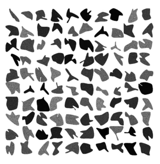 where zk~N(0,1) is a sampled value from the standard Gaussian distribution, k is the number of pixel points contained in the random contour, ζ ∈ (0,1) is the attenuation factor. The average grayscale value of the generated pixels will be smaller with a smaller value of ζ, and a darker defect will be obtained as a whole. It was then filled into contour to generate a Bézier–Gaussian random pseudo-defect close to the true distribution, as shown in Figure 5.
