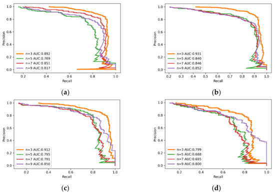 PR curves of the model when varying the convolutional scale n and the fully connected layer m: (a) m = 8; (b) m = 16; (c) m = 32; (d) m = 64.